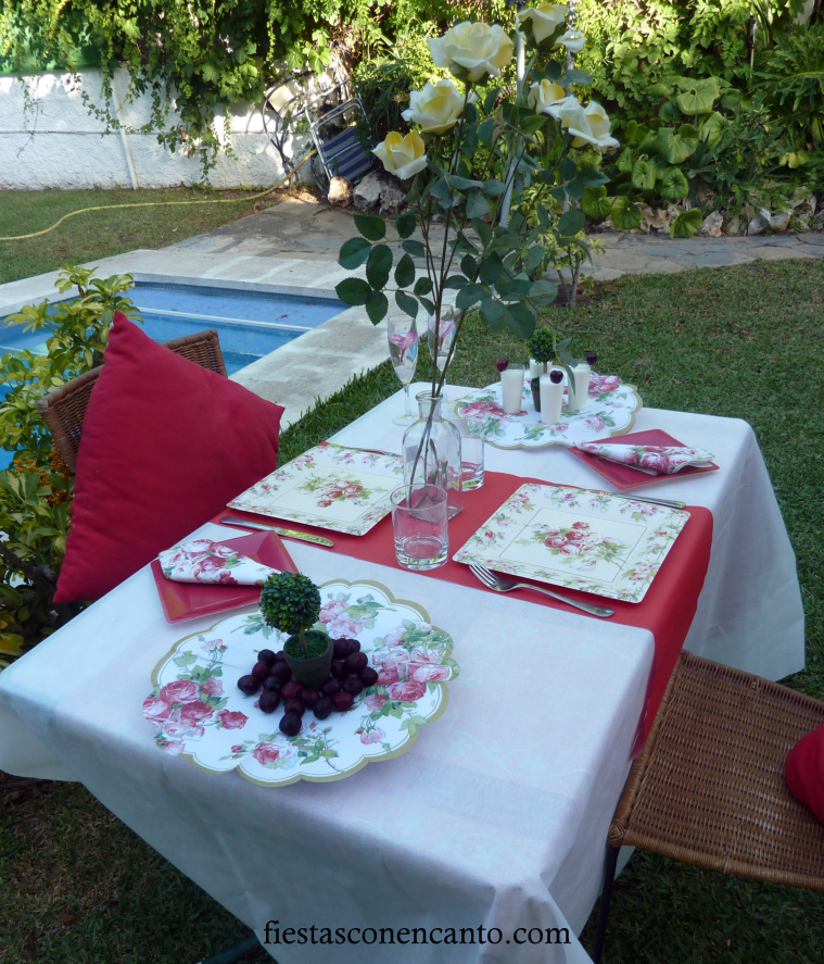 En esta decoración de mesa predominan las rosas y el rojo. Ideal, por ejemplo para una cena íntima gourmet